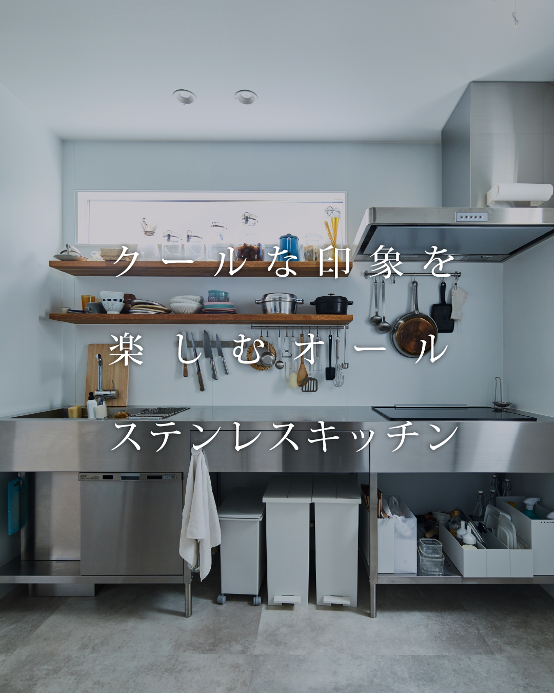 空間としては一見クールですが、ミニマルなキッチンだからこそ木のオープンシェルフのあたたかみが映え、自分なりのレイアウトや使い勝手の良さを変化させて楽しむことができます。