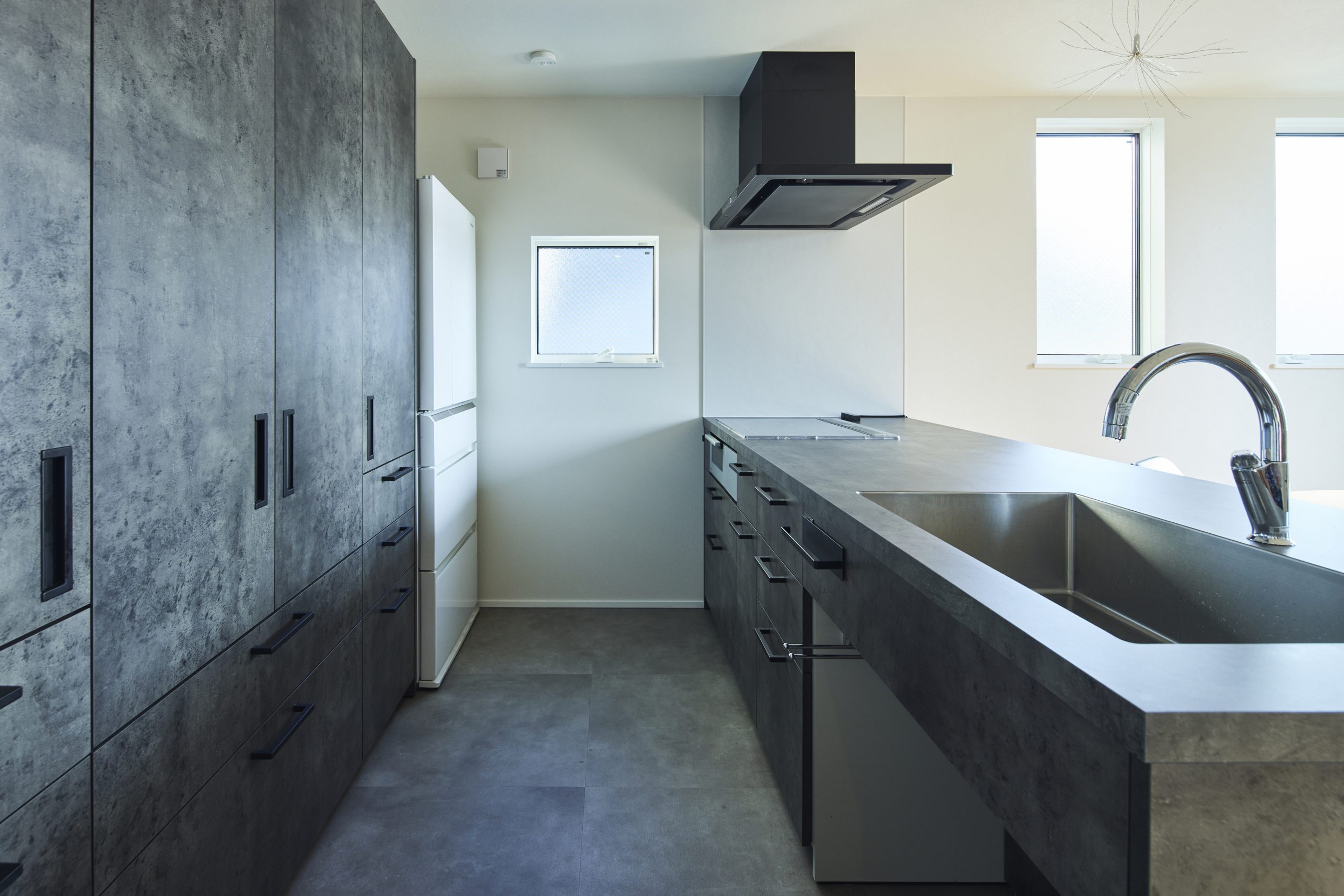 グラフテクトのペニンシュラキッチンはモルタル調のべトングレーでシックな佇まいが目を引きます。